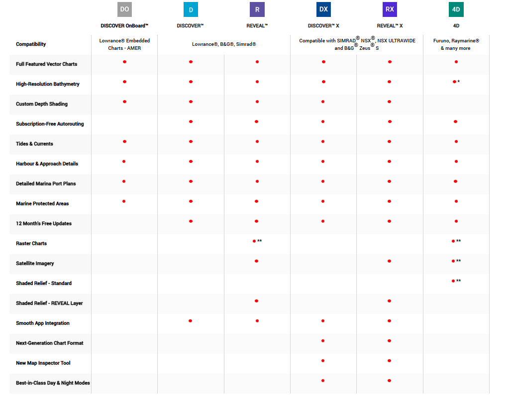 C-MAP Discover är en funktionell karta som fokuserar på säkerhet och praktiska funktioner, vilket gör den idealisk för generell navigering. För en mer omfattande upplevelse erbjuder C-MAP Reveal extra visualiseringar och detaljer, inklusive avancerade funktioner som Shaded Relief och Satellite Overlay. Valet mellan Discover och Reveal beror på dina behov – välj Discover för enkel och pålitlig navigering, eller Reveal om du vill ha en mer detaljerad och visuell navigeringsupplevelse.