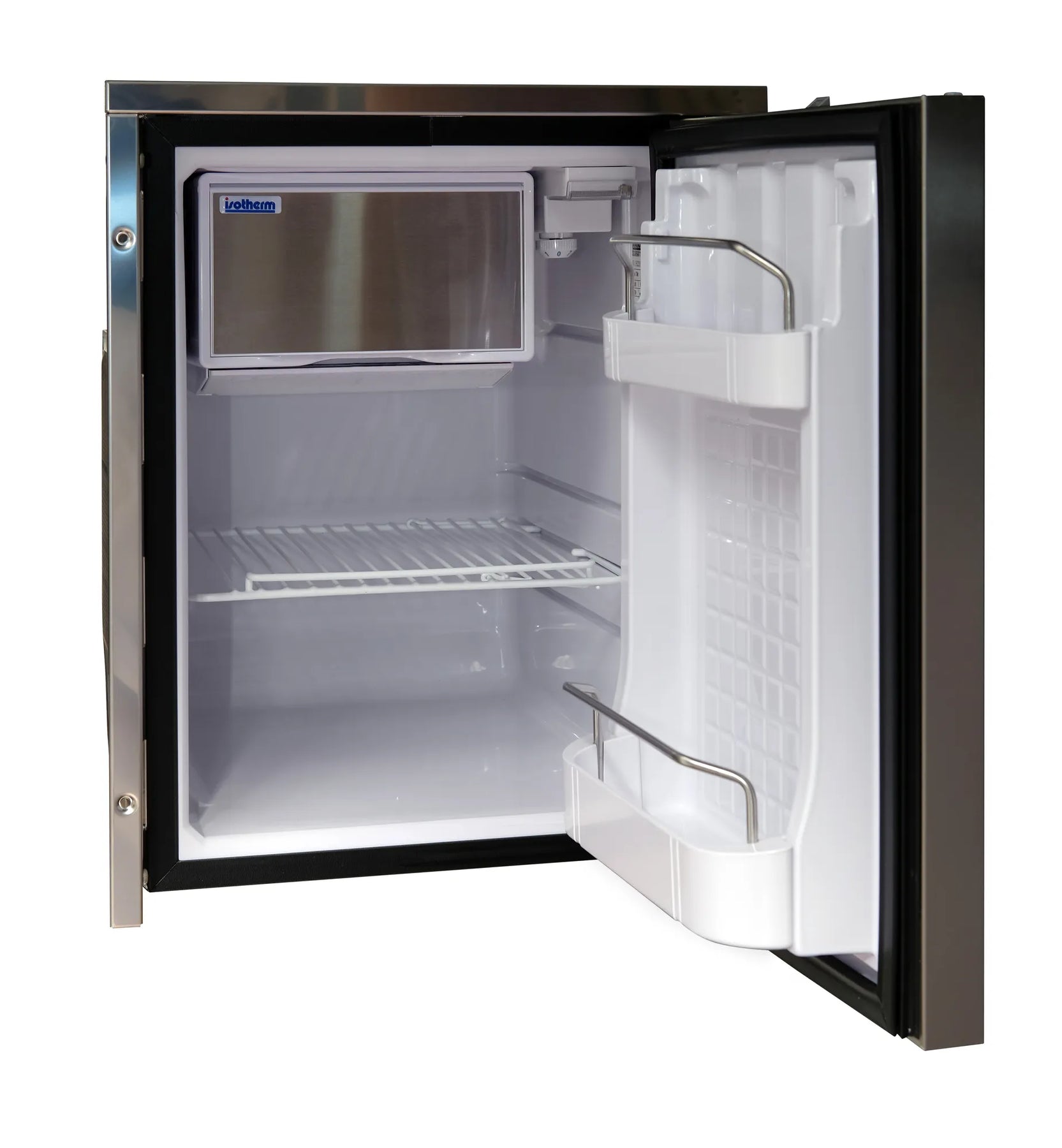 Isotherm CR 49 Inox är ett kylskåp som kombinerar den kompakta storleken och samma "standard" yttermått som CR 42, med en smart inredning och ökad kapacitet. Med en fast monterad kompressor bakom frysfacket, erbjuder CR 49 Inox tillräckligt med utrymme för att rymma både liggande och stående 1,5-liters PET-flaskor, vilket gör det till ett utmärkt val för dem som behöver mer flexibel förvaring i ett kompakt format.