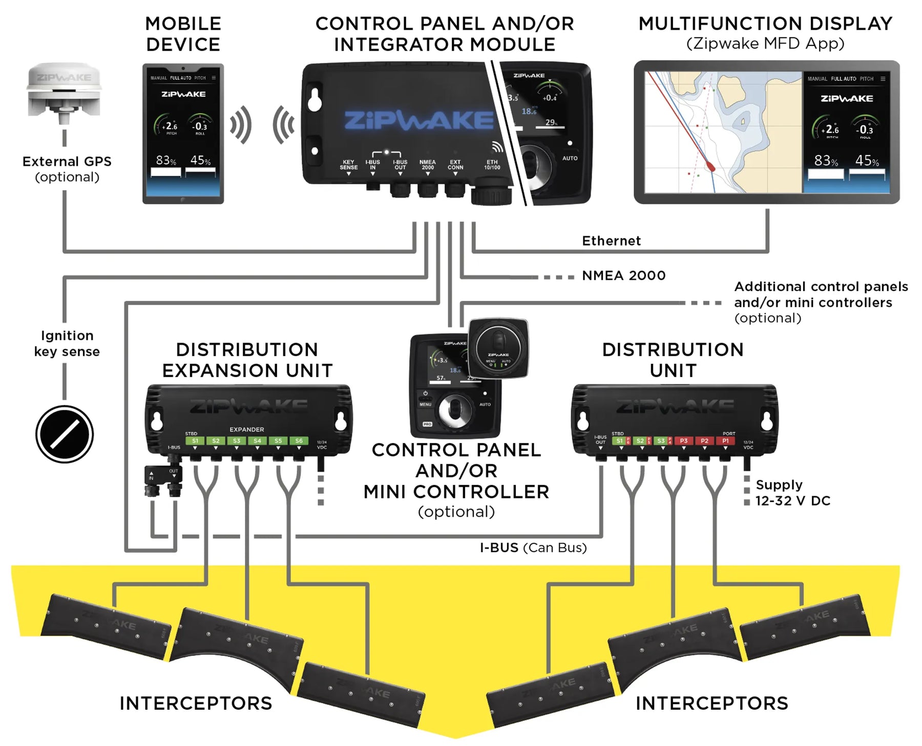 Med Zipwake Integrator Module, som ingår i kitet, kan du enkelt ansluta ditt Zipwake-system till multifunktionsdisplayer (MFD) och smarta enheter. Integratormodulen ger intuitiv och enkel kontroll samtidigt som instrumentpanelen hålls ren och prydlig. Med följer även en distrubitionsenhet PRO och de tillhörade kablaget till kittets samtliga enheter.