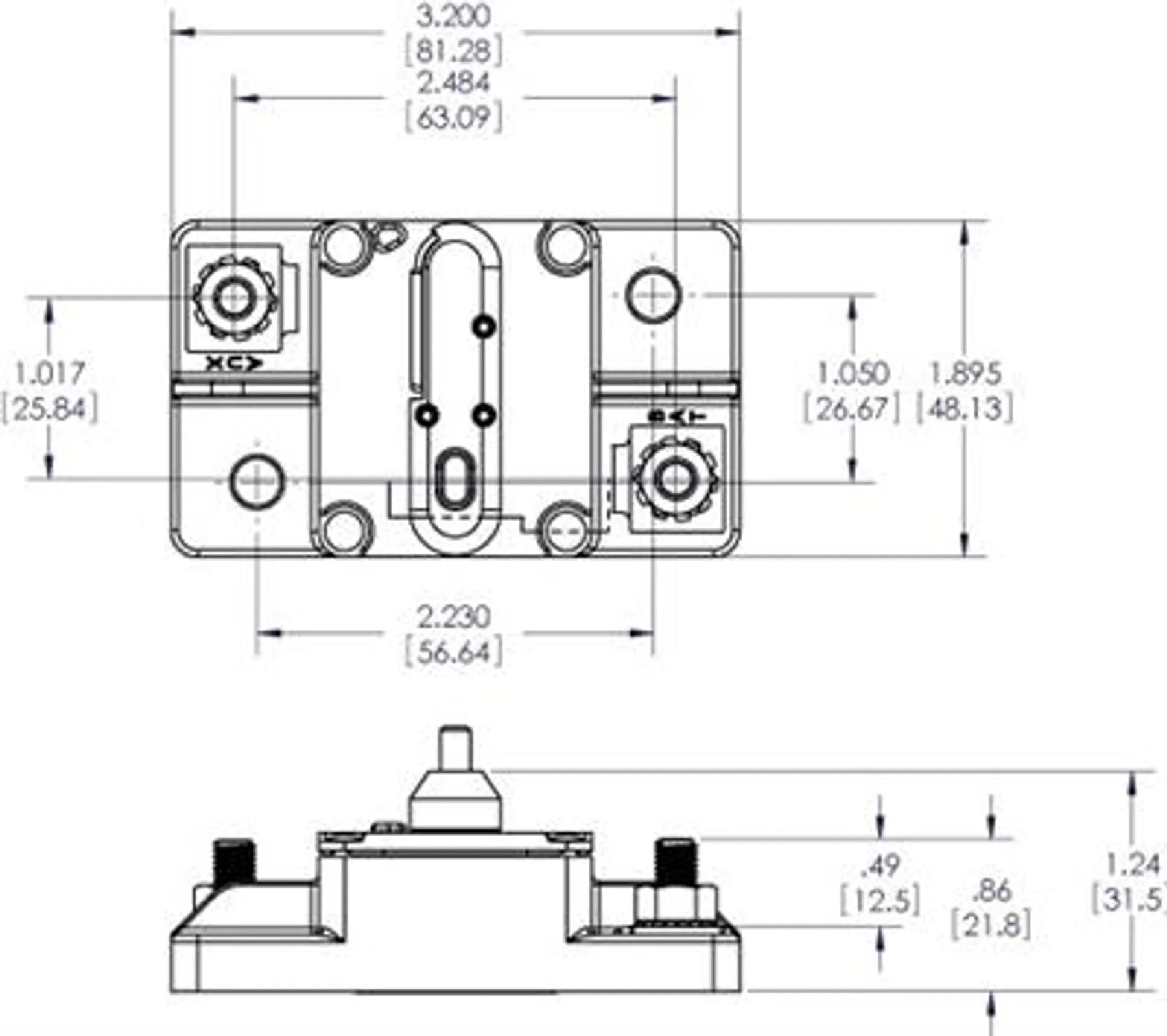 Den har en "Trip Free"-design, vilket innebär att brytaren inte kan hållas stängd efter att den har löst ut vid en felström, vilket ökar säkerheten. Terminalerna är M6-studterminaler som accepterar 1/4" ringterminaler och kräver ett åtdragningsmoment på 50 in-lb (5.65 Nm) för korrekt installation.