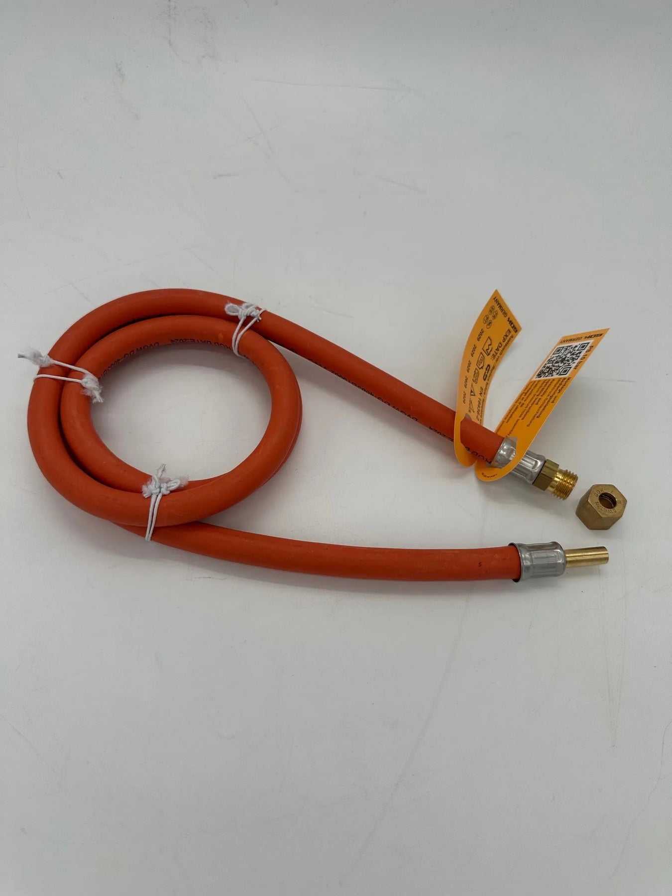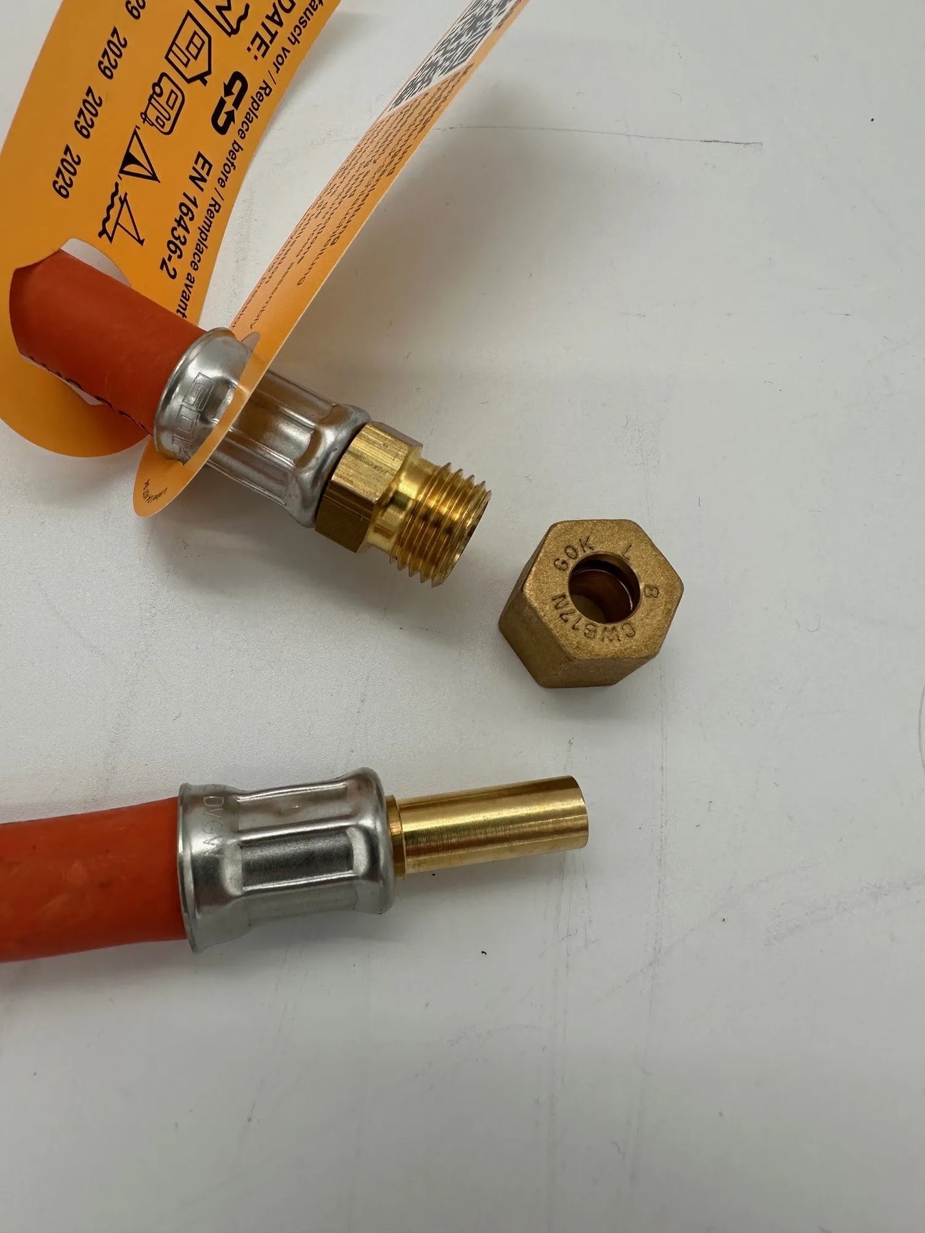 Pressad slang 1200mm mutter med klämringskoppling i ena änden och rakt 8mm rör i andra. Gängan är GOK, dvs en grov gänga. Är vanlig på äldre svenska båtar eller båtar från Europeiska varv.