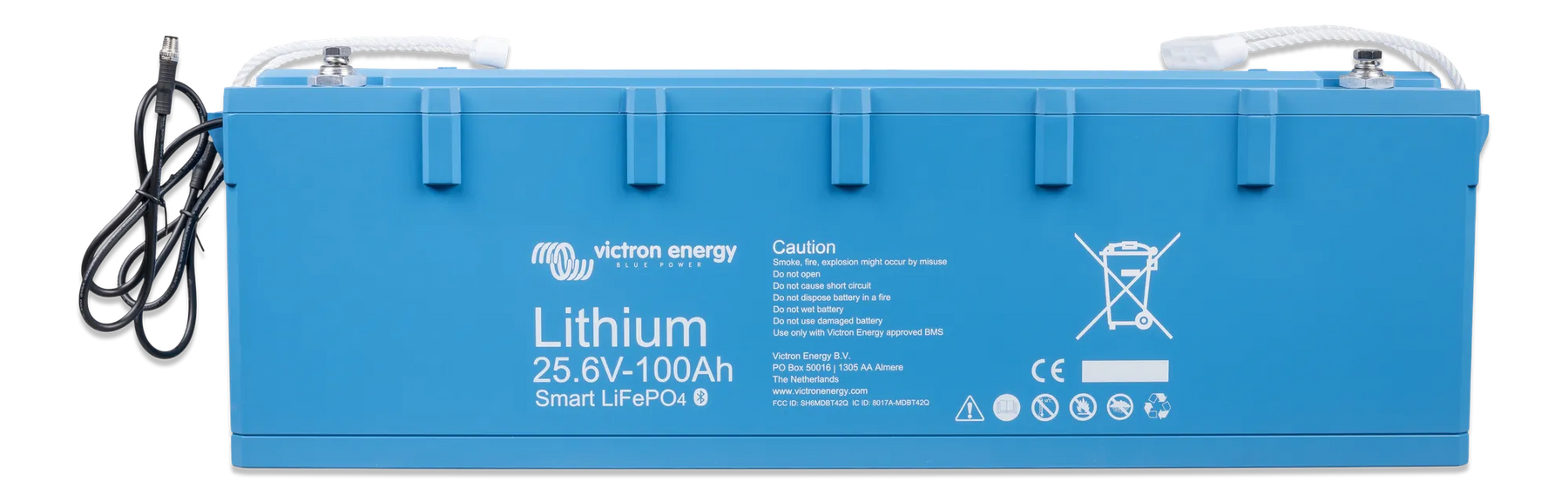 Victron Energy Smart-batterier är litiumjärnfosfatbatterier (LiFePO4) och finns i 12,8 V eller 25,6 V i olika kapaciteter. De kan kopplas i serie, parallellt och serie/parallellt för att skapa en batteribank för systemspänningar på 12 V, 24 V eller 48 V. Det maximala antalet batterier i ett system är 20, vilket ger en maximal energilagring på 84 kWh i ett 12 V-system och upp till 102 kWh i ett 24 V-1) och 48 V1) system. En enda LFP-cell har en nominell spänning på 3,2 V. Ett 12,8 V-batteri består av fyra seriekopplade celler och ett 25,6 V-batteri består av åtta seriekopplade celler.