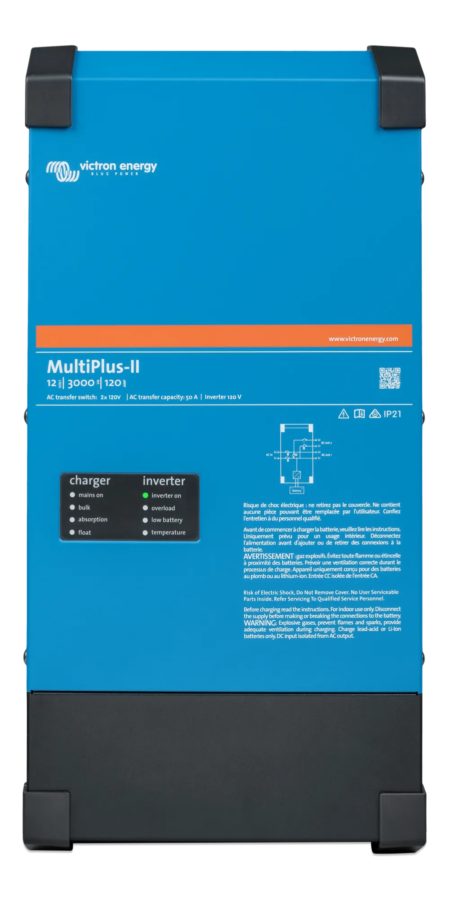 Med en robust stålkonstruktion, hög prestanda och många anpassningsbara funktioner är MultiPlus-II 12/3000/120-50 2x120V det perfekta valet för både små och stora energisystem som kräver tillförlitlighet, effektivitet och flexibilitet.