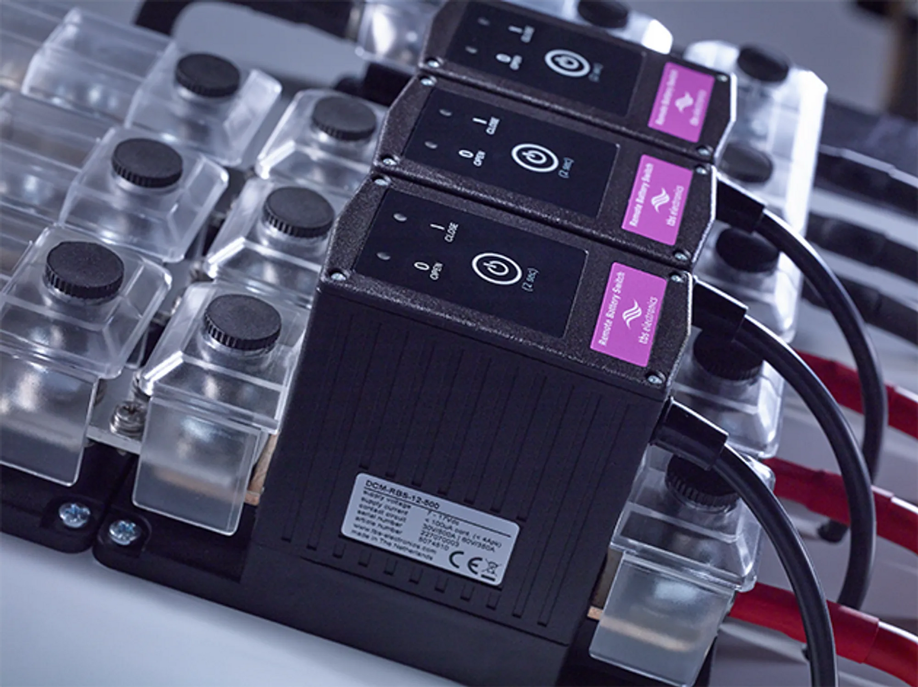 DCM Remote Battery Switch 24V 500A is a remotely controlled battery switch from the DC Modular series, developed to handle high currents of up to 500 amperes continuously at 24V. It is based on a smart magnetic locking contactor technology, which allows it to hold its position (on or off) without consuming power – something that is especially valuable in energy-efficient systems.