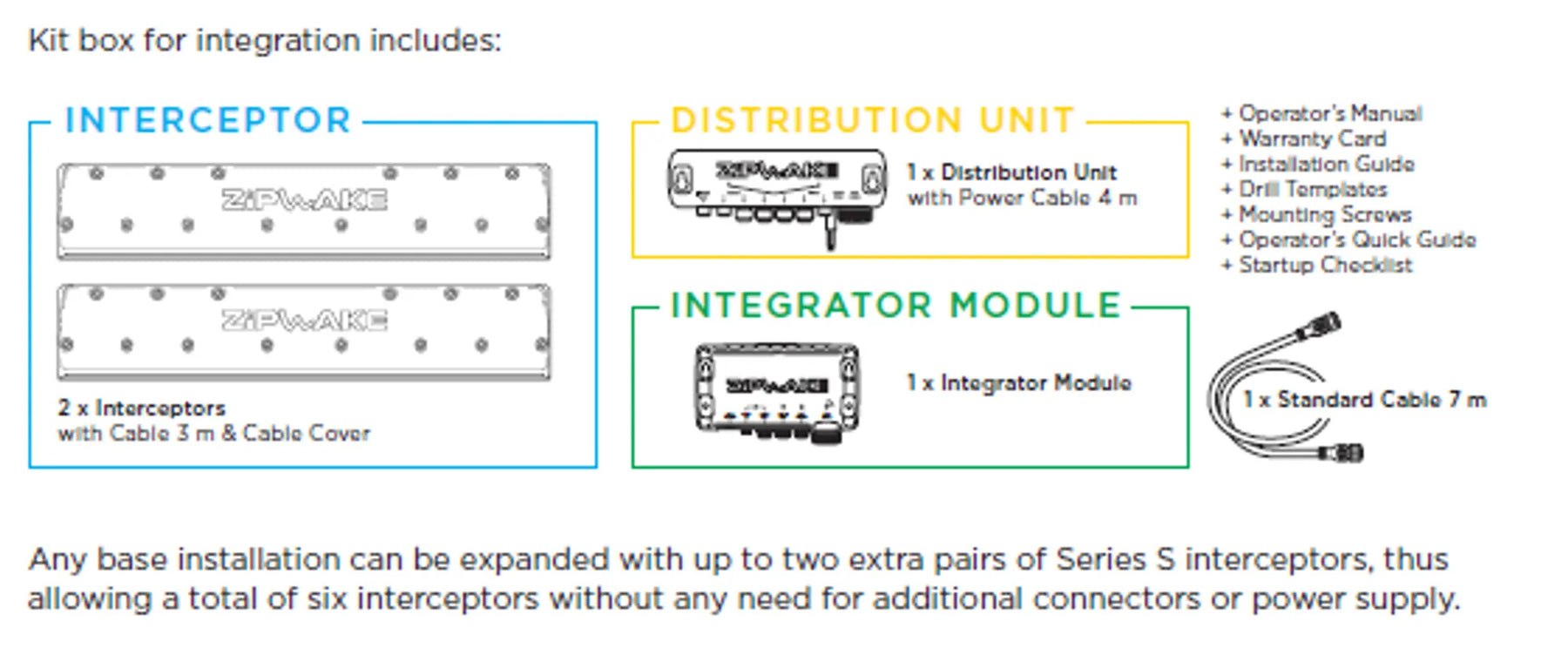 Any base installation can be expanded with up to two additional pairs of Series S interceptors, allowing a total of six interceptors without the need for extra connectors or power supply. The Kit Box can also be expanded with multiple control units. The Zipwake Mini Controller is a common add-on.
