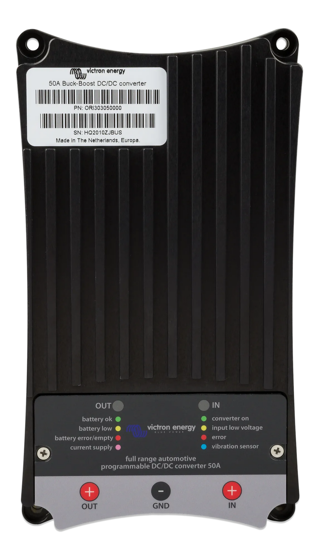 Buck-Boost DC/DC Converter 50A has a built-in engine detection system, which ensures that the converter only activates when the engine is running, thereby preventing the starter battery from being completely discharged. The converter is fully programmable and can be configured to charge a 12V or 24V battery from either a 12V or 24V generator, making it very flexible and adaptable for different system configurations. Programming is done easily via a PC application, allowing adjustment of settings such as maximum charging current, maximum input current, and other parameters to optimize charging.