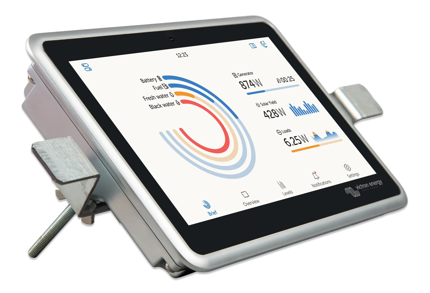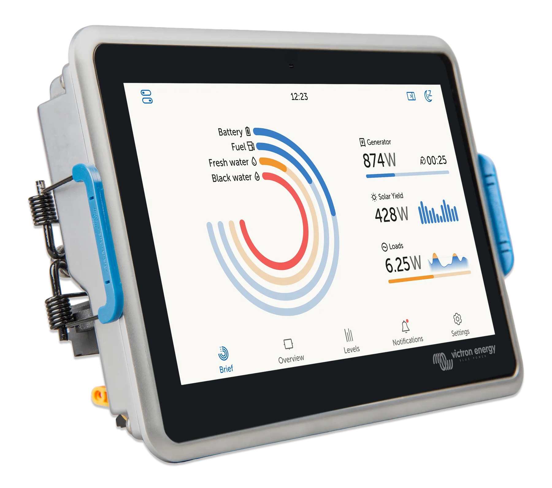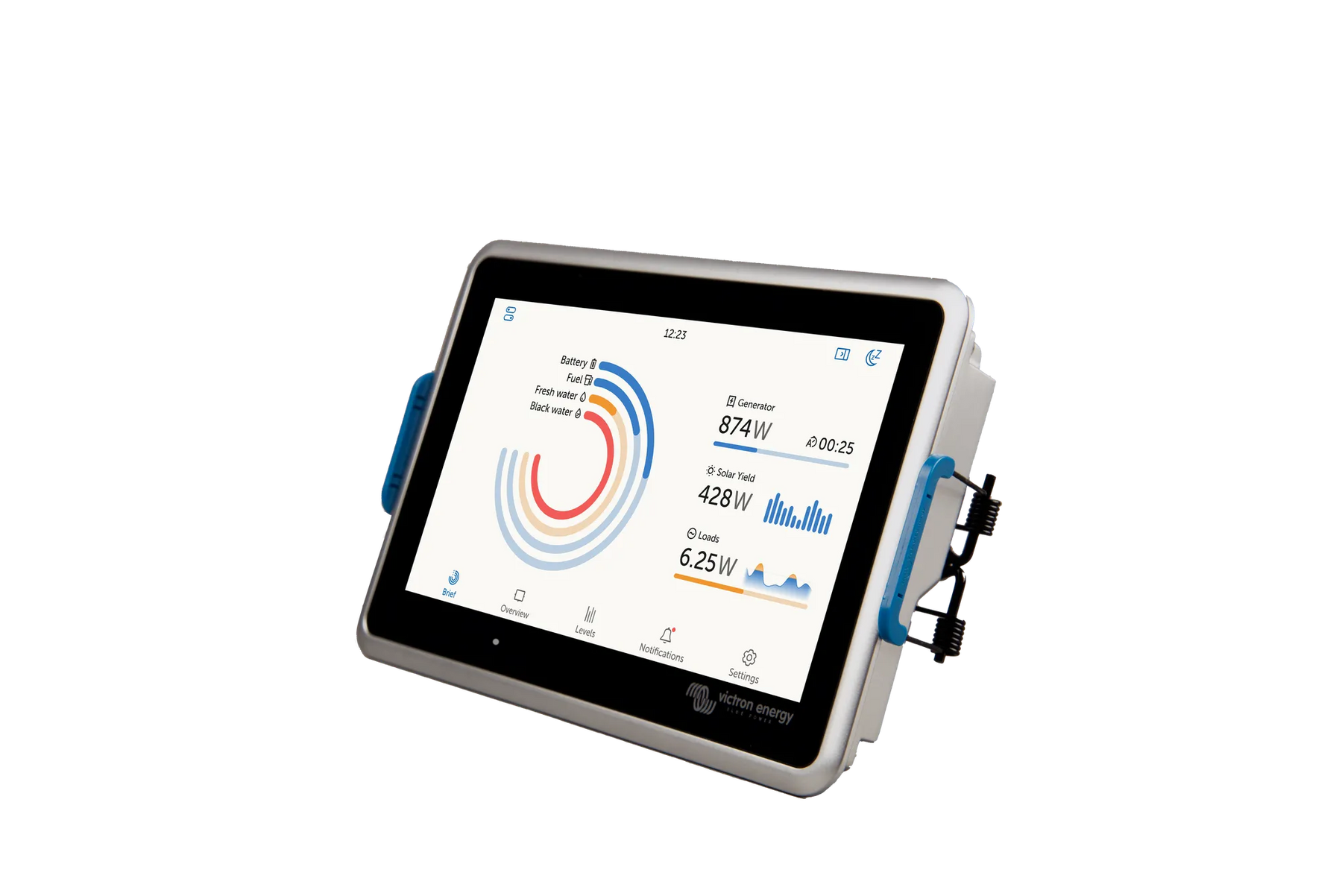 With Ekrano GX, you can easily monitor and optimize system performance from anywhere via the Victron Remote Management (VRM) portal or directly via the built-in touchscreen. The built-in 7-inch touchscreen gives you an immediate overview of your system, where you can see battery status, energy consumption, electricity production from solar panels, generator and grid, as well as check tank levels and temperatures. The touchscreen can also be locked to prevent unauthorized use.