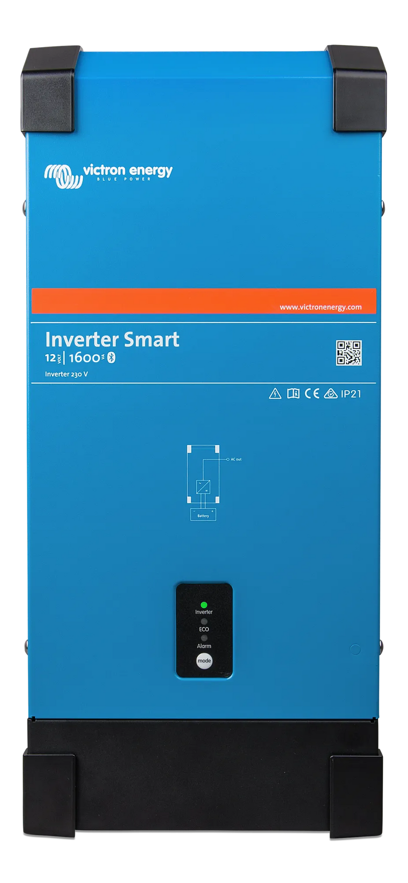 Phoenix Inverter 12/1600 230V is a robust inverter that converts 12V to 230V, perfect for powering a variety of devices such as LED lamps, halogen lamps, and electric tools. With its built-in Bluetooth function, you can easily monitor and adjust settings directly from your smartphone or tablet. Among other things, you can set low battery warning, shutdown levels, dynamic shutdown depending on load, output voltage (210-245V), frequency (50 or 60 Hz), and activate and adjust ECO mode to save energy.