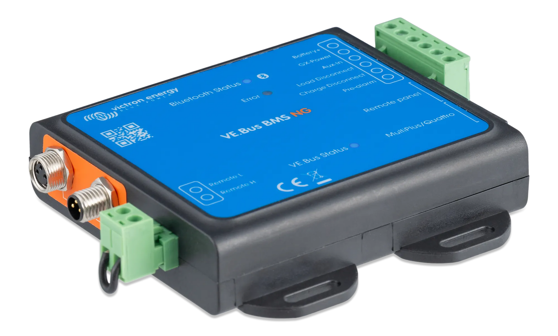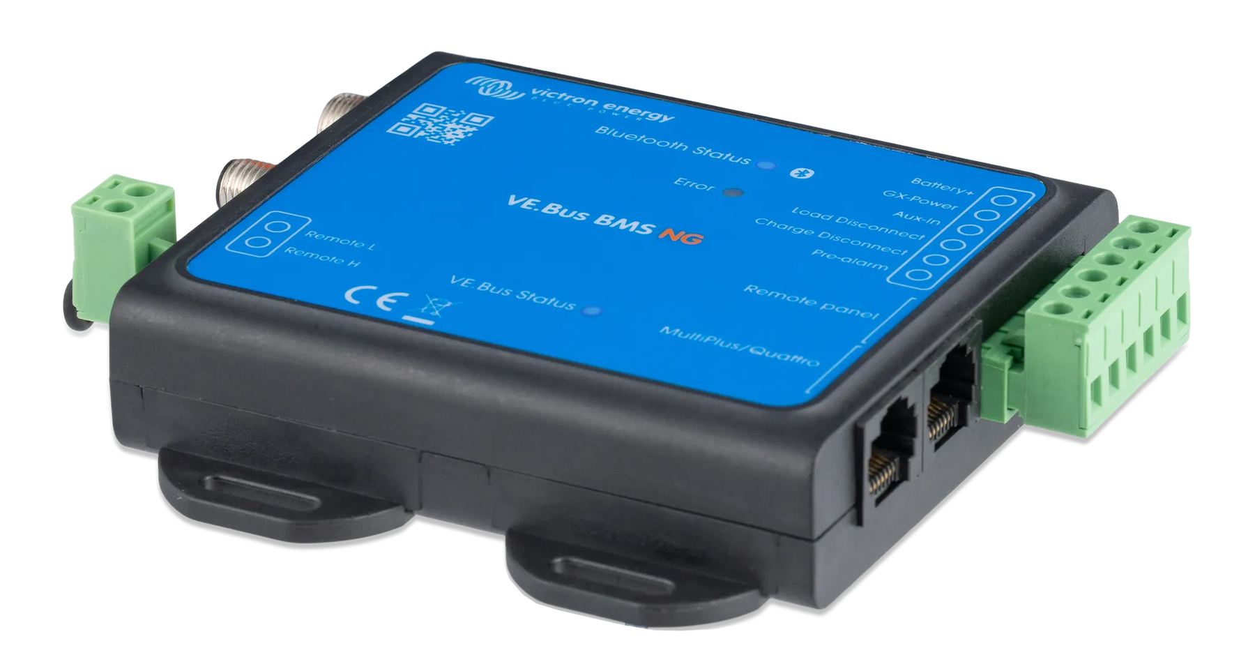 Thanks to built-in Bluetooth, no external accessories are needed for monitoring – the BMS communicates directly with all Lithium NG batteries in the system, allowing you to easily follow the status via the VictronConnect app. Important information is displayed in real time, such as the battery's state of charge (SoC), temperature, any warnings, and alarms. No separate SmartShunt is needed either, as the VE.Bus BMS NG itself receives current data and charging information directly from the batteries.