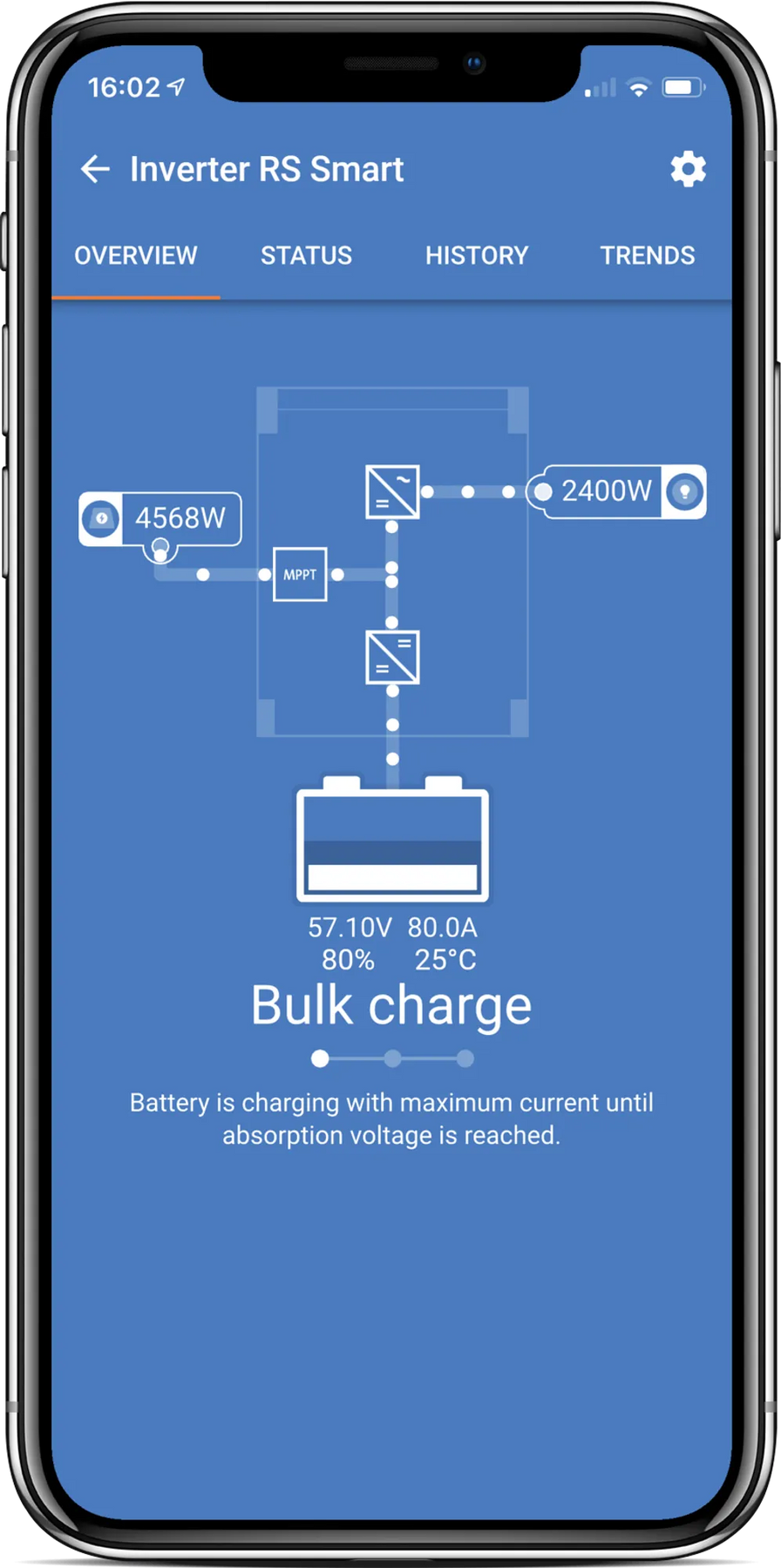Trots sin kraftfulla kapacitet väger växelriktaren endast 11 kg, vilket gör den enkel att installera och hantera. Den är utrustad med en integrerad skärm där du kan läsa av viktiga parametrar för batteri och växelriktare. För ännu större flexibilitet kan dessa uppgifter också övervakas via Bluetooth med hjälp av VictronConnect-appen, vilket möjliggör enkel konfigurering och övervakning direkt från din smartphone eller surfplatta.