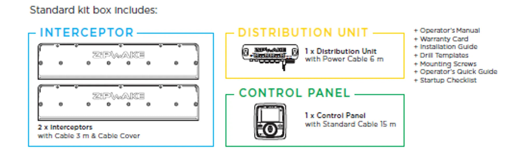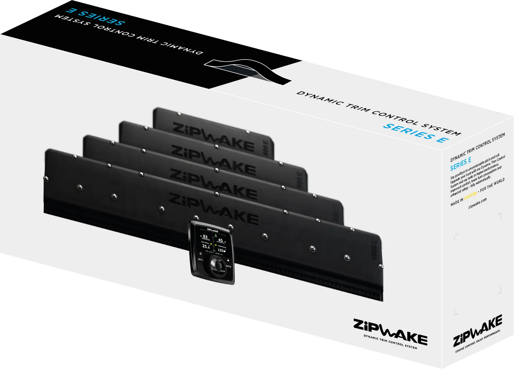 Zipwake Kit Box Serie E innehåller allt du behöver för att montera ett komplett, automatiskt trimsystem. Kitet bygger på två interceptorer ur Serie E, anpassade för planande och halvplanande båtar mellan ca 15 och 30 meter.