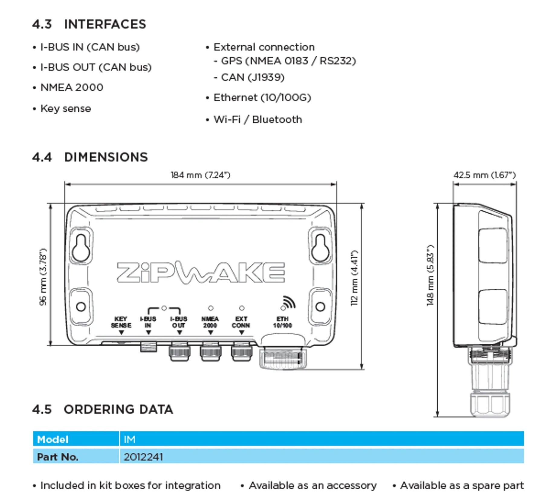 Alla Zipwake system kan dock utrustas med upp till tre extra kontrollpaneler och/eller minikontroller för den som vill ha både pekknappar och Zipwakes unika styrhjul för maximal manuell kontroll. Integratormodulen stöder anslutning till ett brett urval av MFD-varumärken och modeller via en Ethernet-anslutning. Den trådlösa funktionen gör det möjligt att ansluta smartphones och surfplattor via Zipwake appen för trådlös visning, styrning, konfigurering och programuppdateringar. Modulen har även ett CAN-gränssnitt för ytterligare extern systemintegration.